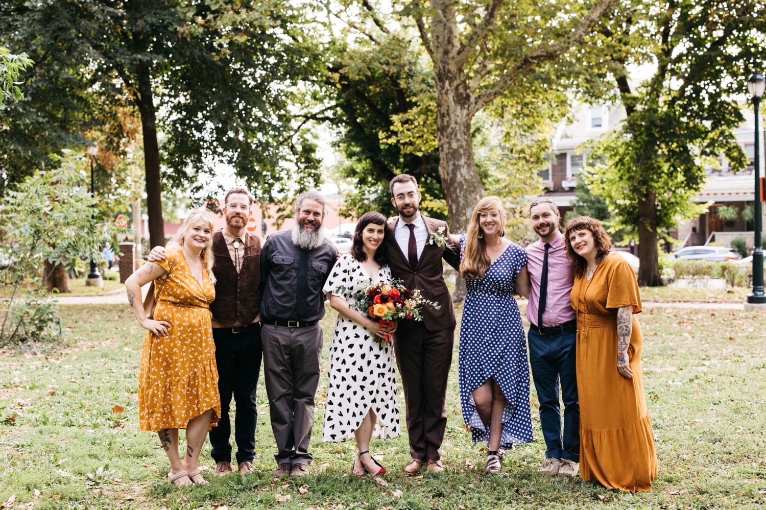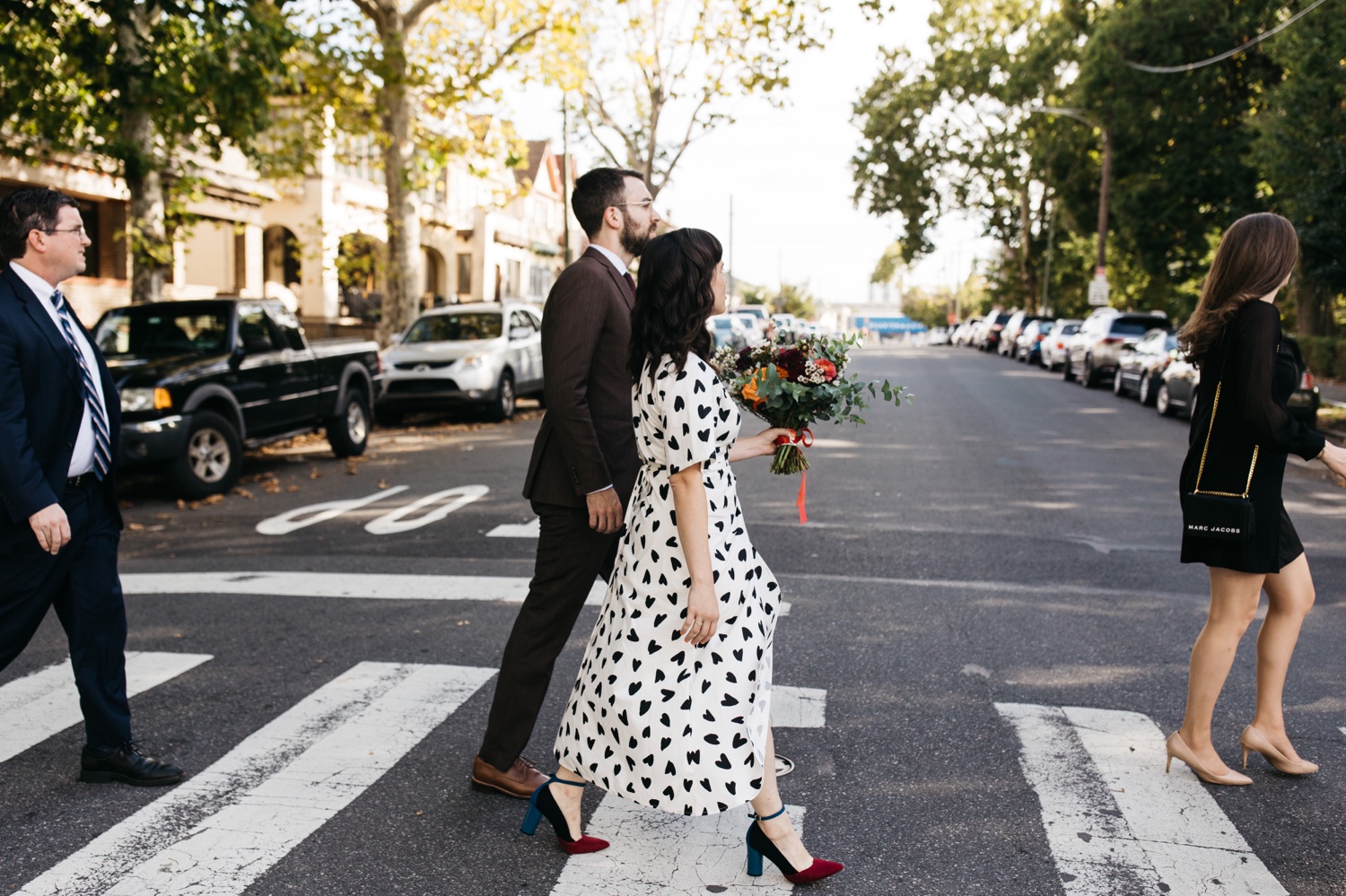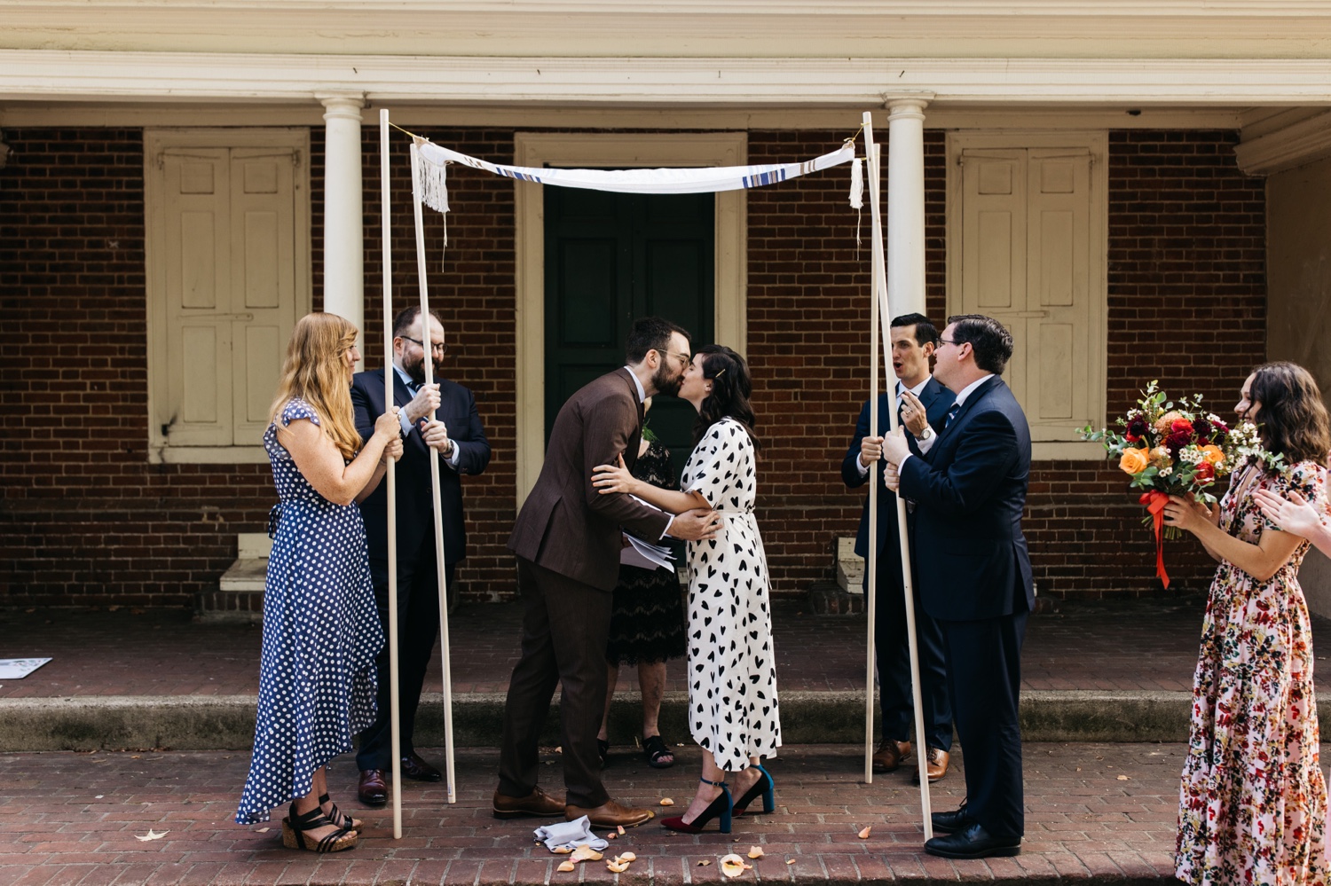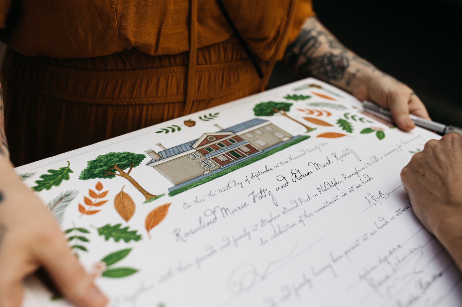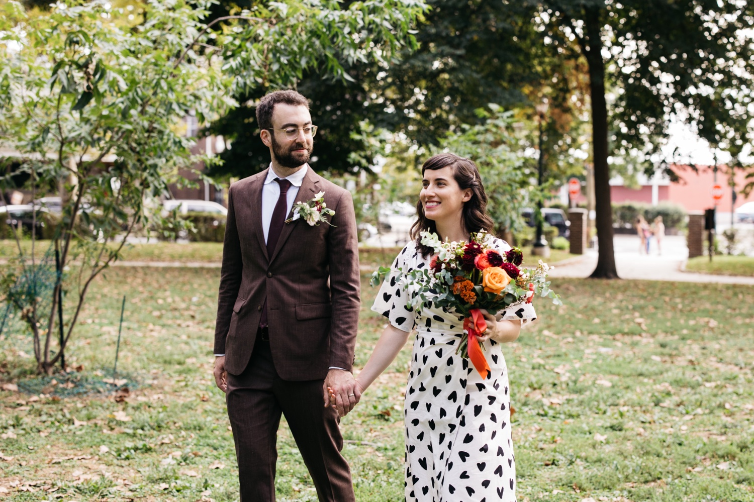 To start the day, the couple invited just their family members and close friends to walk a few blocks from their house in South Philly to Stephen Girard park. Adam’s grandmother officiated their intimate ceremony at the park with a beautiful Ketubah designed by a close friend in attendance.