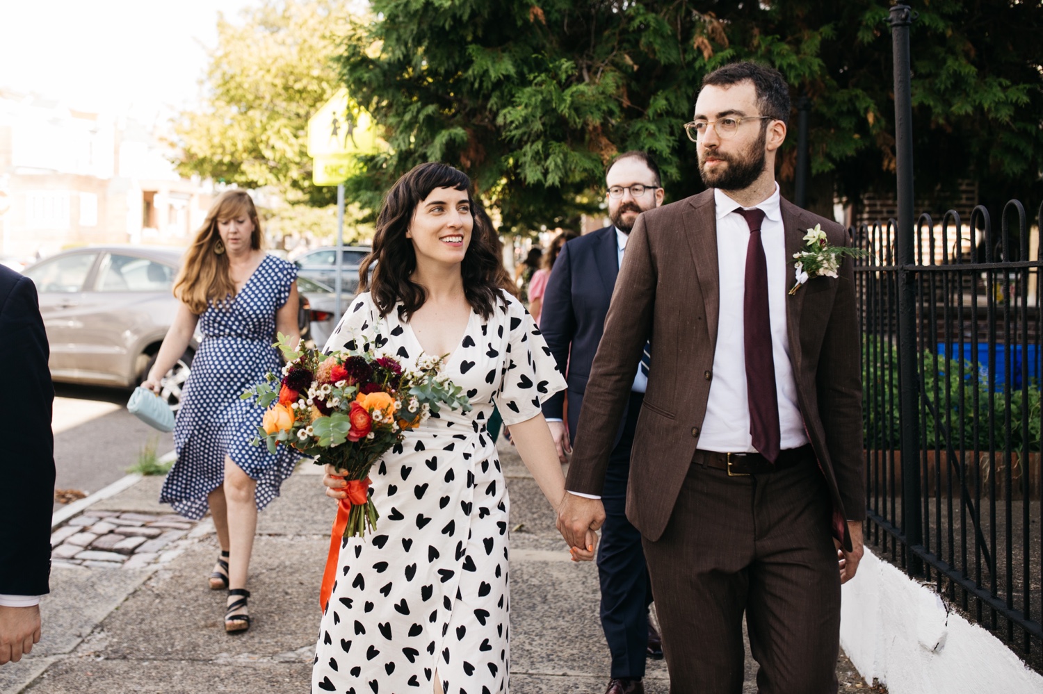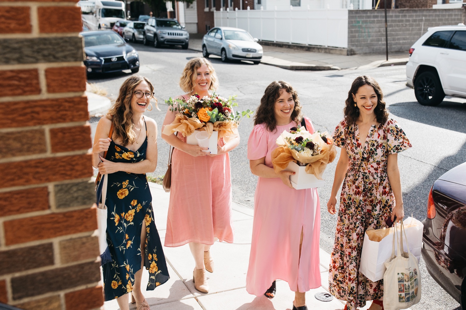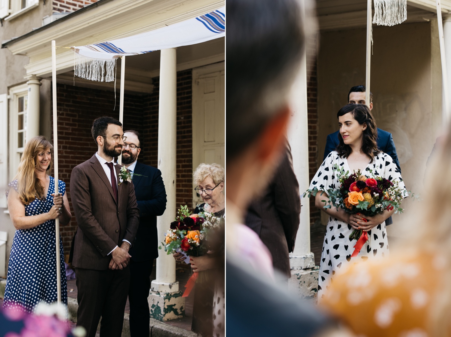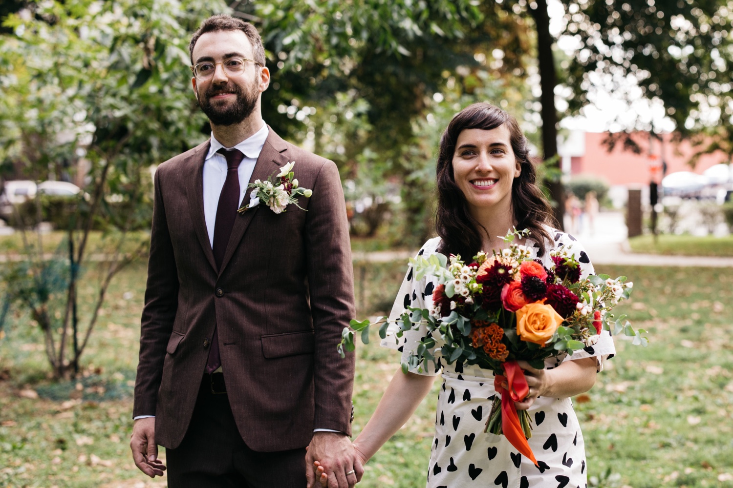 To start the day, the couple invited just their family members and close friends to walk a few blocks from their house in South Philly to Stephen Girard park. Adam’s grandmother officiated their intimate ceremony at the park with a beautiful Ketubah designed by a close friend in attendance.