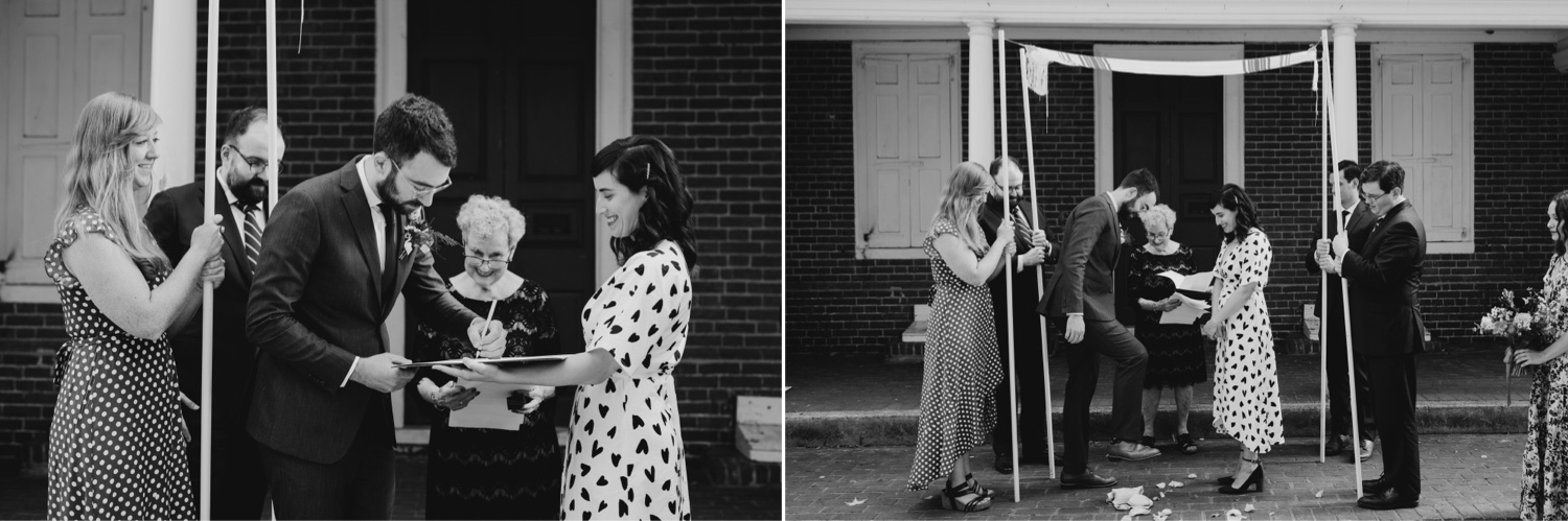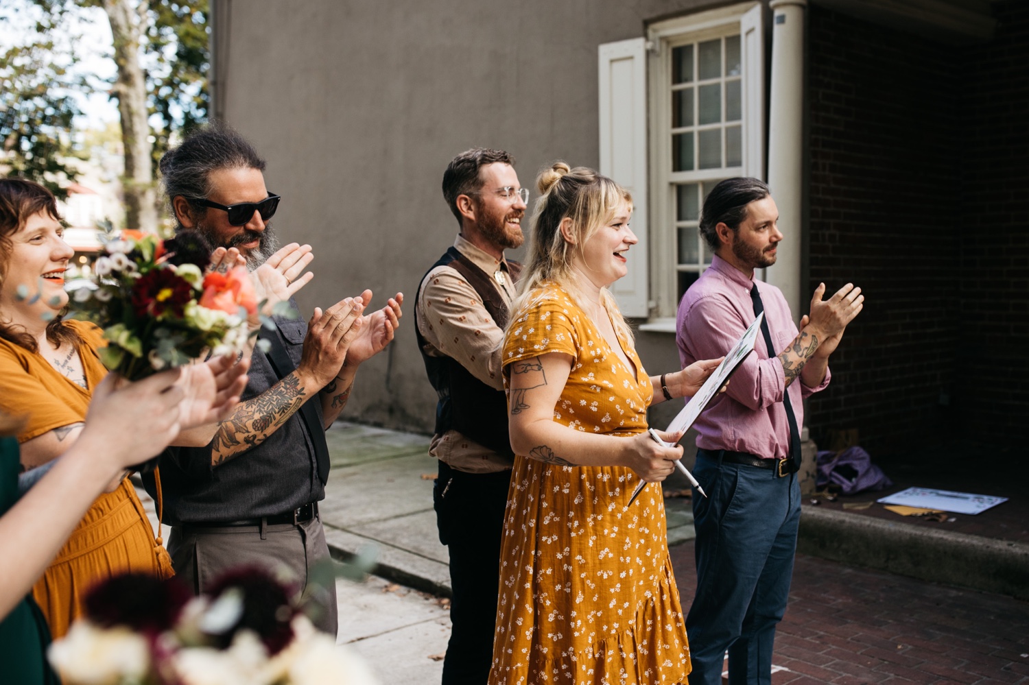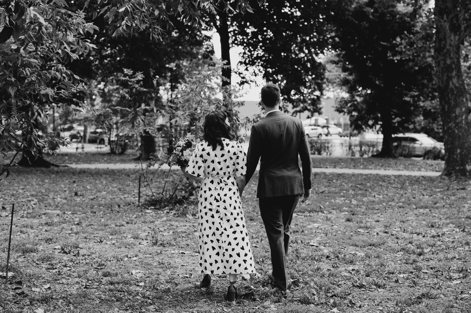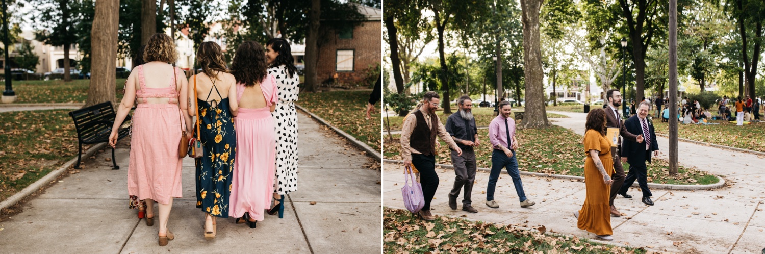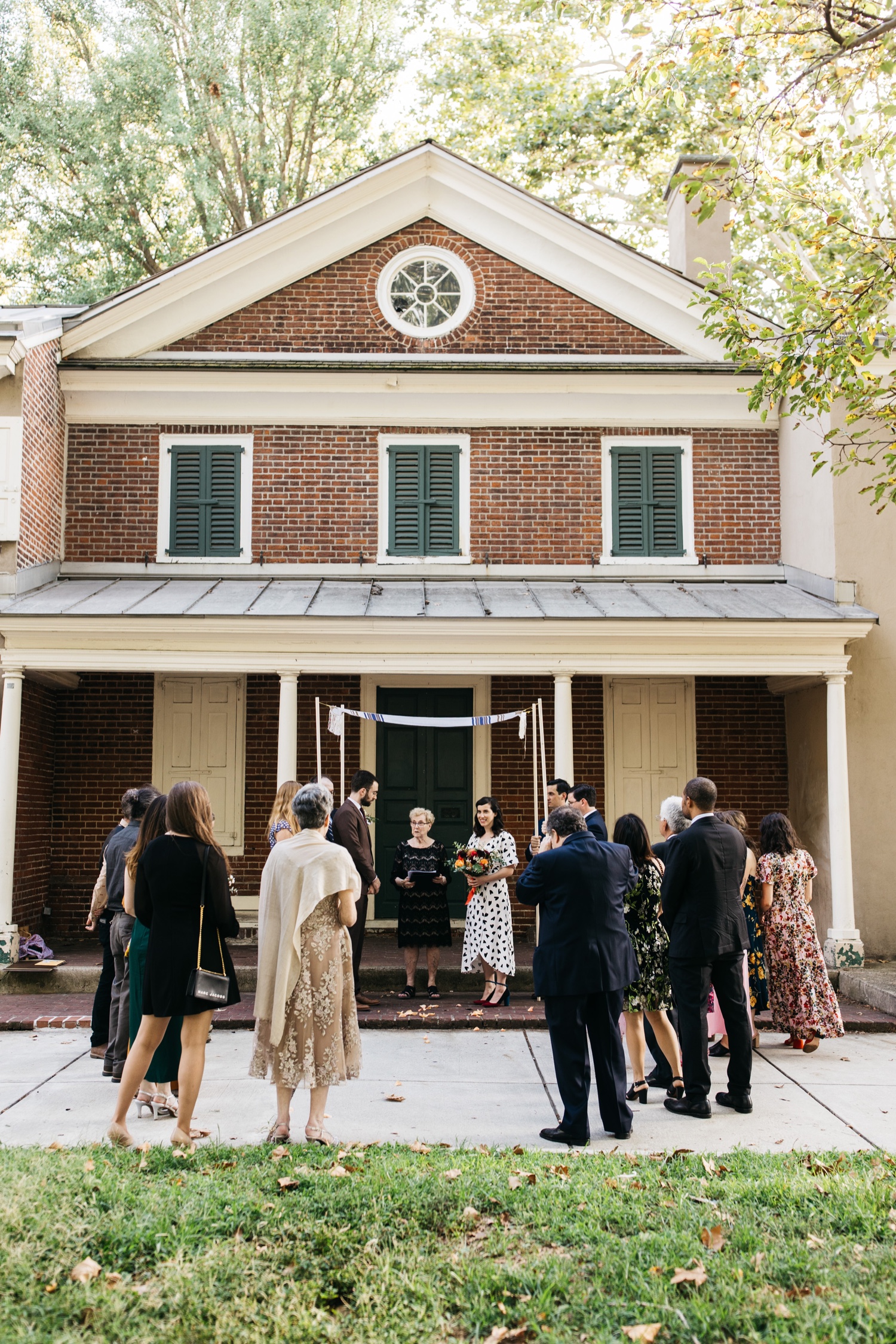 To start the day, the couple invited just their family members and close friends to walk a few blocks from their house in South Philly to Stephen Girard park. Adam’s grandmother officiated their intimate ceremony at the park with a beautiful Ketubah designed by a close friend in attendance.