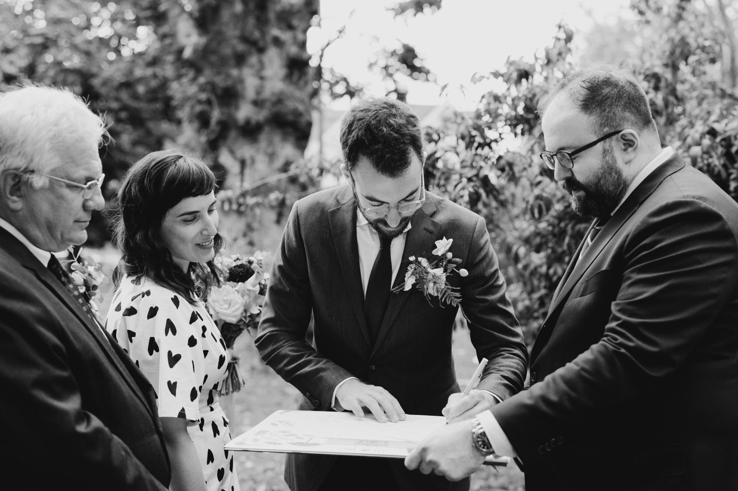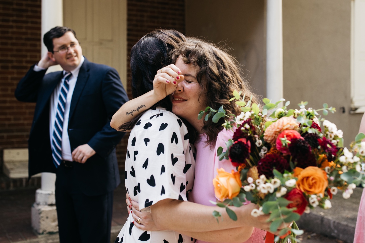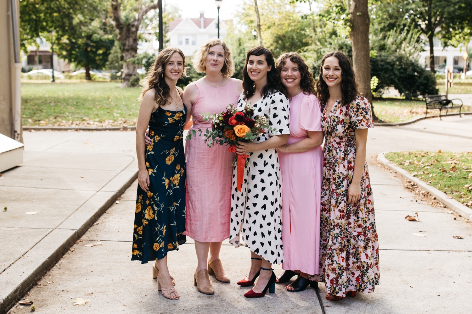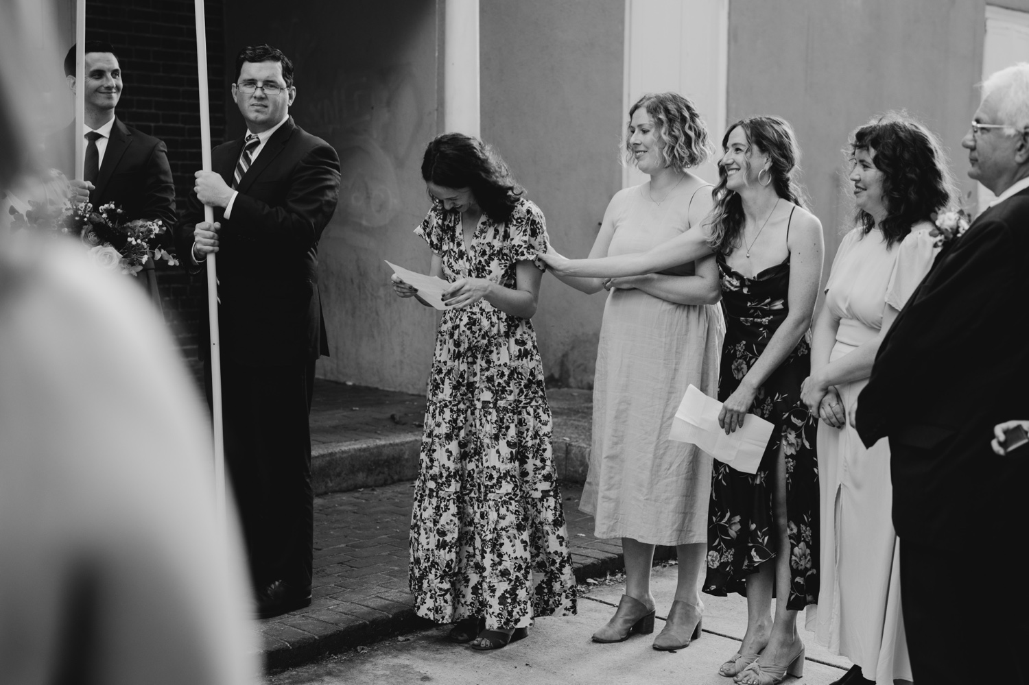 To start the day, the couple invited just their family members and close friends to walk a few blocks from their house in South Philly to Stephen Girard park. Adam’s grandmother officiated their intimate ceremony at the park with a beautiful Ketubah designed by a close friend in attendance.