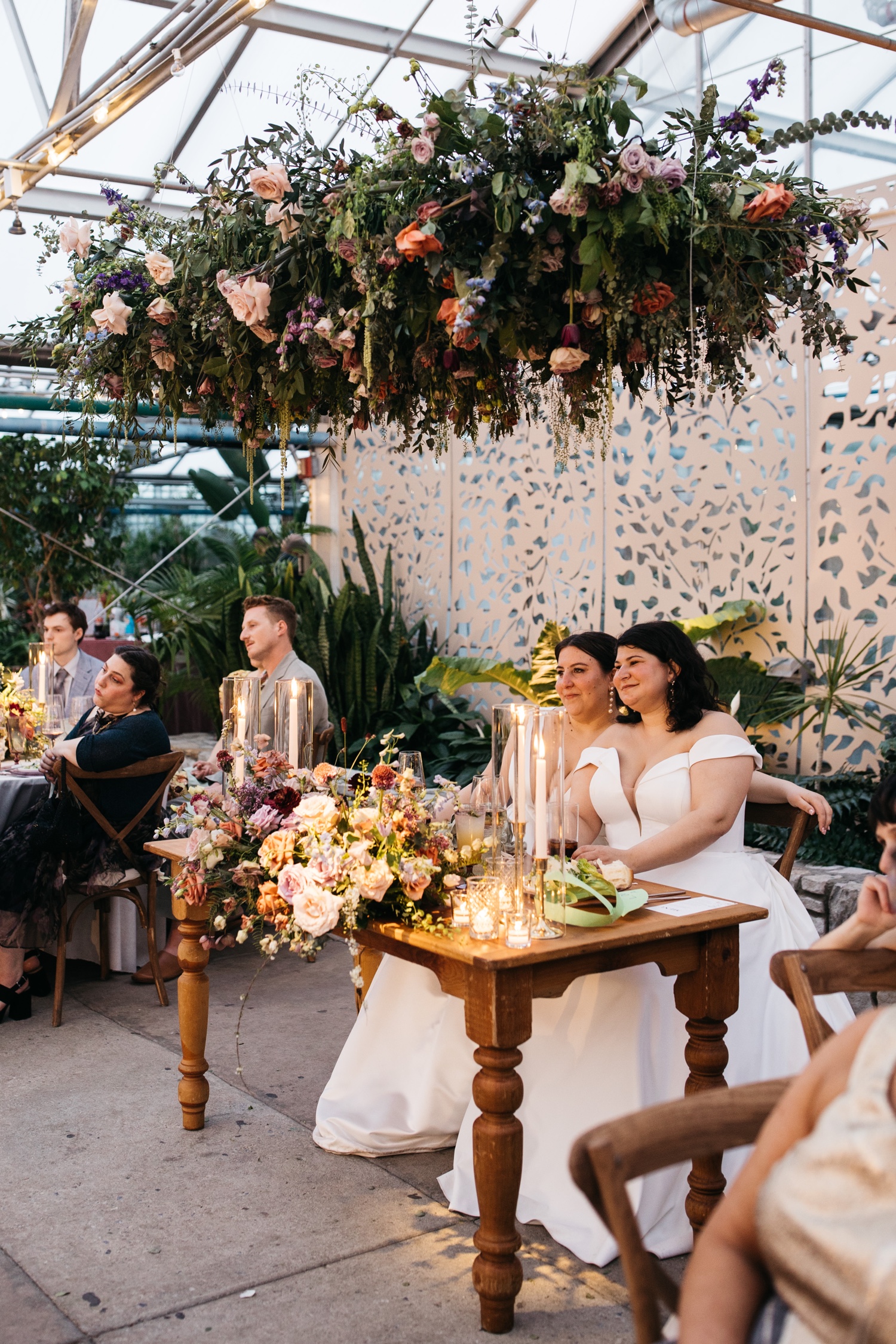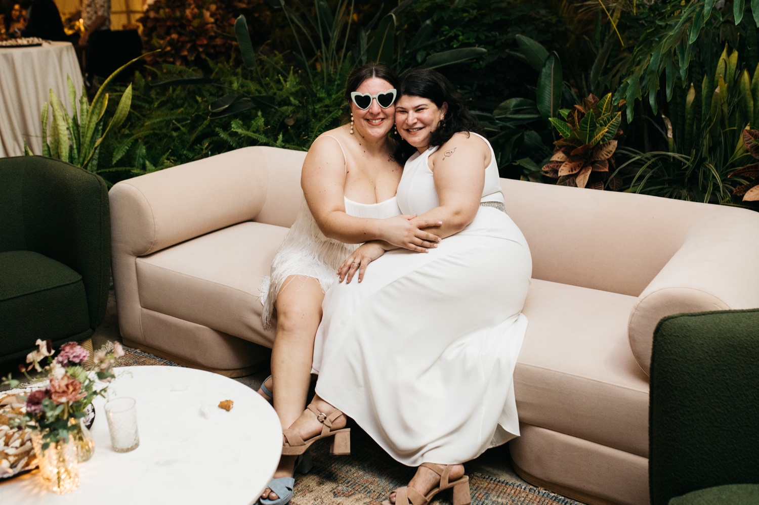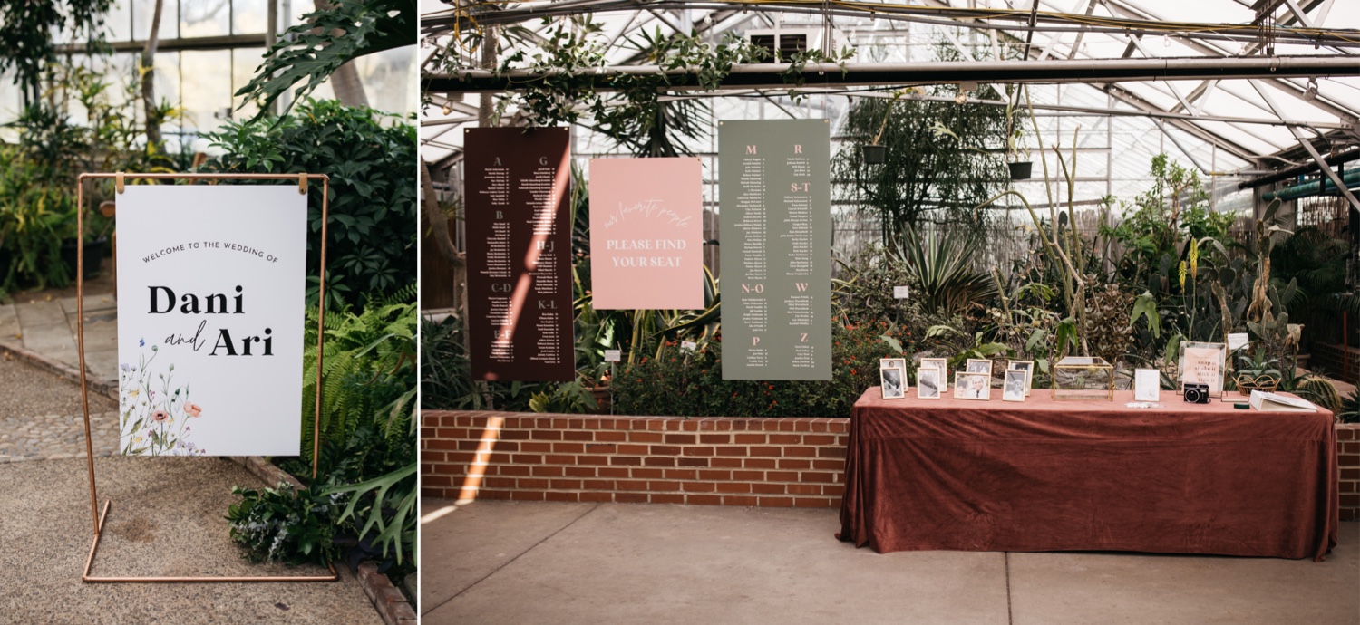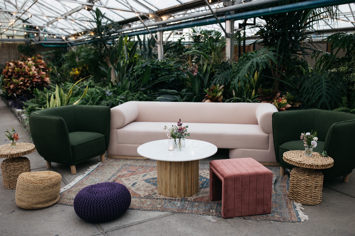The Horticulture Center, which happens to be one of my favorites in Philly, was a perfect choice for their celebration. It is a stunning greenhouse in Fairmount Park filled with giant plants and lots of natural light. Sebesta Design provided the gorgeous florals for the ceremony and reception that fit so perfectly with the greenhouse vibes. The pink and green lounge area by Vine and Oak doubled as a beautiful backdrop for couple portraits.