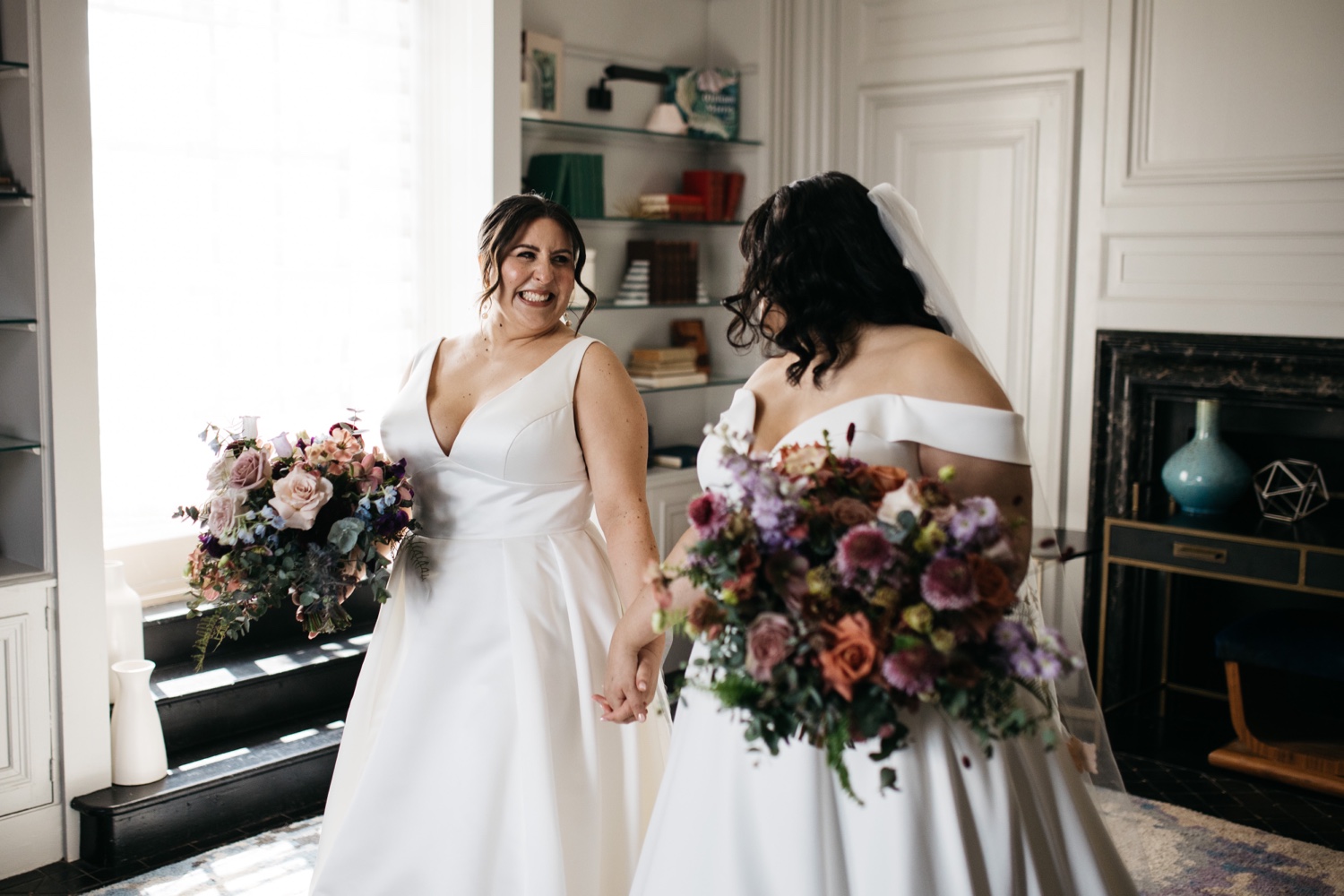 First, I got a chance to meet Dani and Ari at their beautiful plant- and art-filled home in South Philly for their engagement session. It was great to get to know them before their wedding day. Bonus point was that I also got to meet their adorable pup Winnie, who stole the show on their wedding day.
